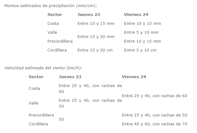 Con la información proporcionada por la Dirección Meteorológica de Chile (DMC), la Onemi informó que durante los días jueves 23 y viernes 24 de abril, los eventos meteorologicos se registrarían con las siguiente aproximaciones: