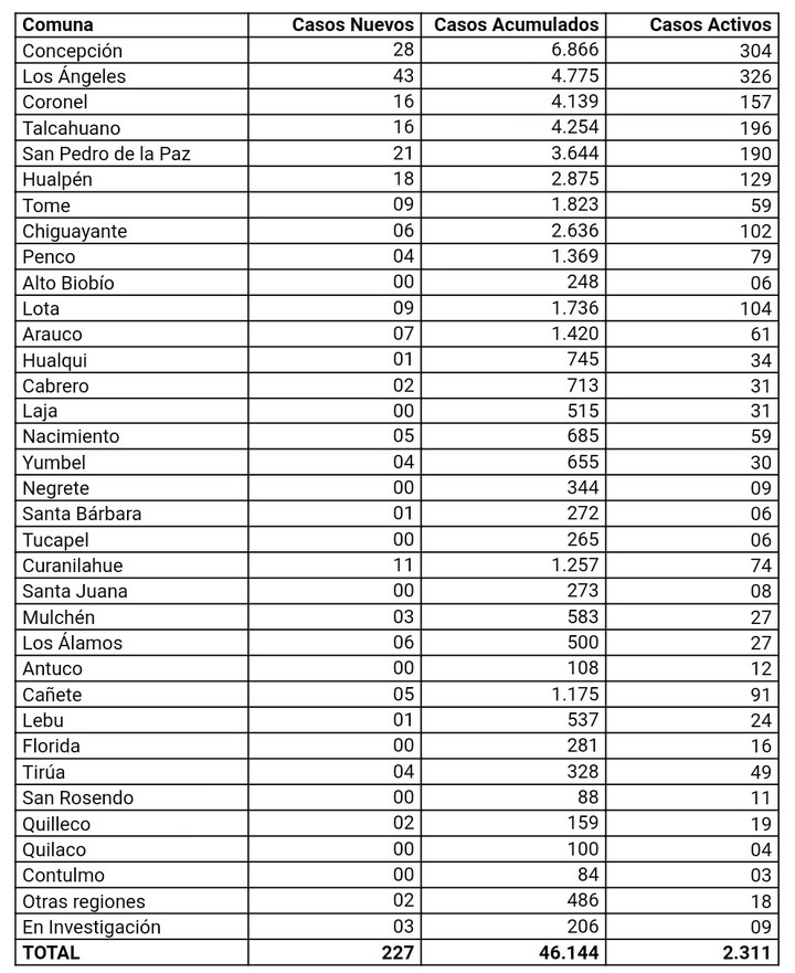 Las comunas que presentaron la mayor cantidad de nuevos casos fueron Los Ángeles (43), Concepción (28), San Pedro de la Paz (21), Hualpén (18), Talcahuano (16), Coronel (16) y Curanilahue (11).