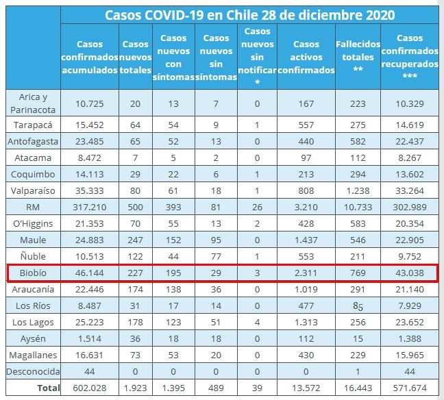 Por otro lado, tanto en la región como en el país, no se reportaron nuevas personas fallecidas por Covid-19. Esto responde a una menor inscripción de defunciones en el Registro Civil, lo que se normalizaría con el paso de los días, explicaron las autoridades. En el Biobío el total de muertes es de 769.
