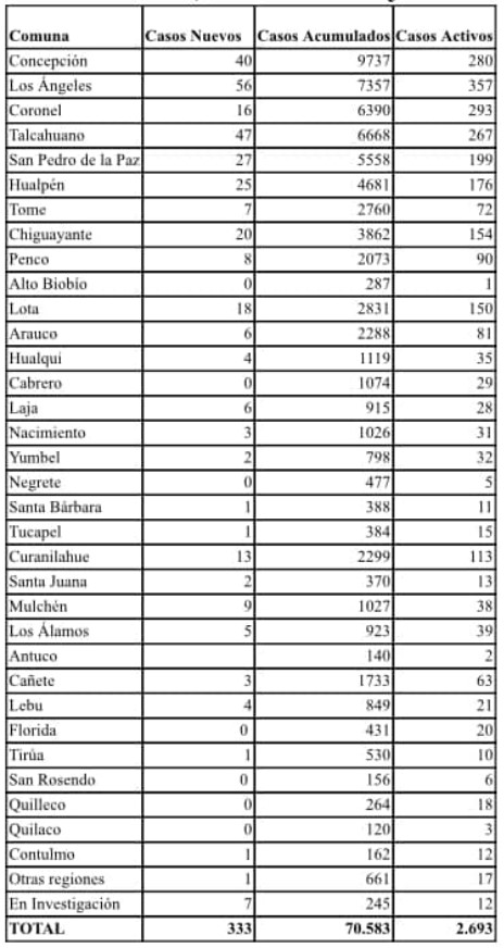 En tanto, las comunas con más de 100 casos activos son Los Ángeles (357), Coronel (293), Concepción (280), Talcahuano (267), San Pedro de la Paz (199), Hualpén (176), Chiguayante (154), Lota (150) y Curanilahue (113).