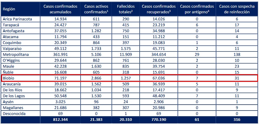 En tanto, las comunas con más de 100 casos activos son Los Ángeles (361), Concepción (297), Coronel (276), Talcahuano (272), San Pedro de la Paz (227), Hualpén (195), Chiguayante (184), Lota (158) y Curanilahue (143).