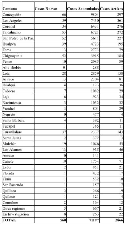 Las comunas que presentaron la mayor cantidad de nuevos casos fueron Concepción (66), Los Ángeles (59), Talcahuano (53), San Pedro de la Paz (52), Chiguayante (52), Hualpén (39), Curanilahue (37), Coronel (34) y Lota (28).