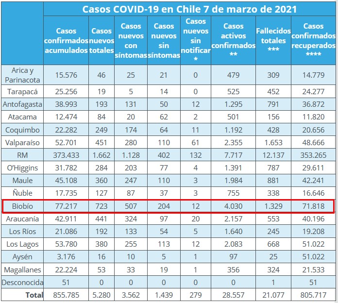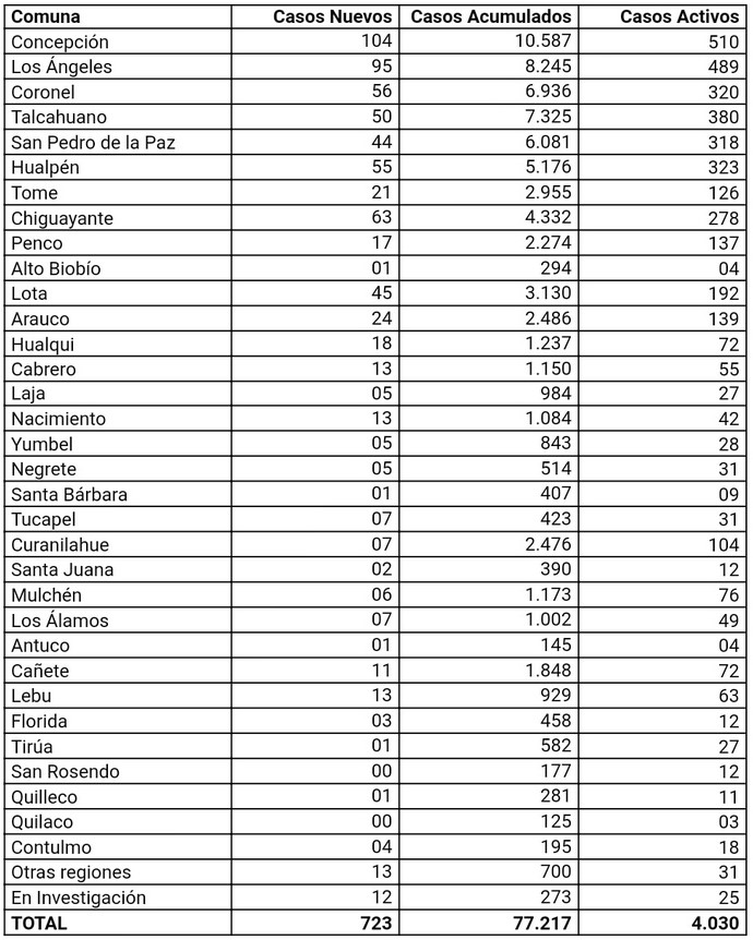En tanto, las comunas con más de 100 casos activos son Concepción (510), Los Ángeles (489), Talcahuano (380), Hualpén (323), Coronel (320), San Pedro de la Paz (318), Chiguayante (278), Lota (192), Arauco (139), Penco (137), Tomé (126) y Curanilahue (104).