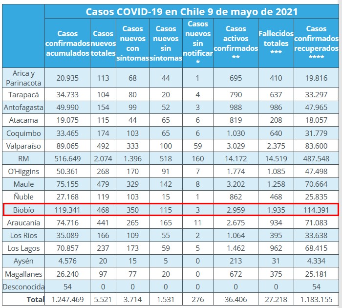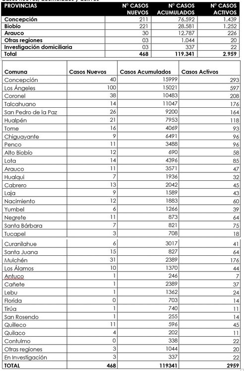 En el reporte oficial de este domingo, la Región del Biobío registró 468 nuevos contagios confirmados de Covid-19, representando una leve baja respecto a los más de 500 reportados ayer.