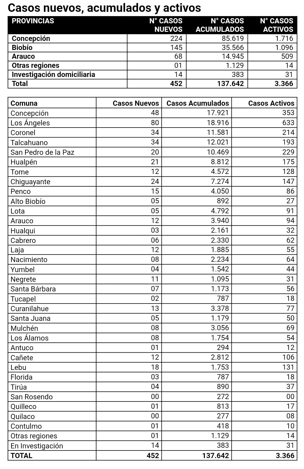 La comuna de Los Ángeles sigue liderando las cifras a nivel regional, con 80 nuevos contagios confirmados y 633 activos. Le sigue Concepción, con 353 activos; San Pedro de la Paz, con 229; y Coronel, con 214.
