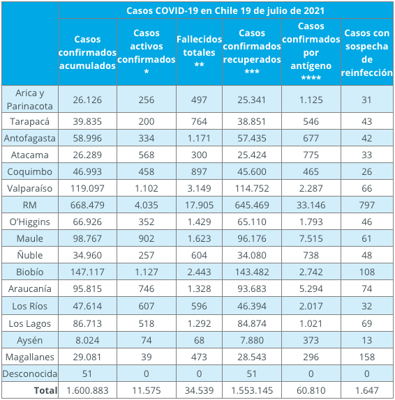 Este lunes 19 de julio el Ministerio de Salud informó en el reporte covid-19 que Chile registró 25 nuevos decesos inscritos y 1.015 casos positivos.