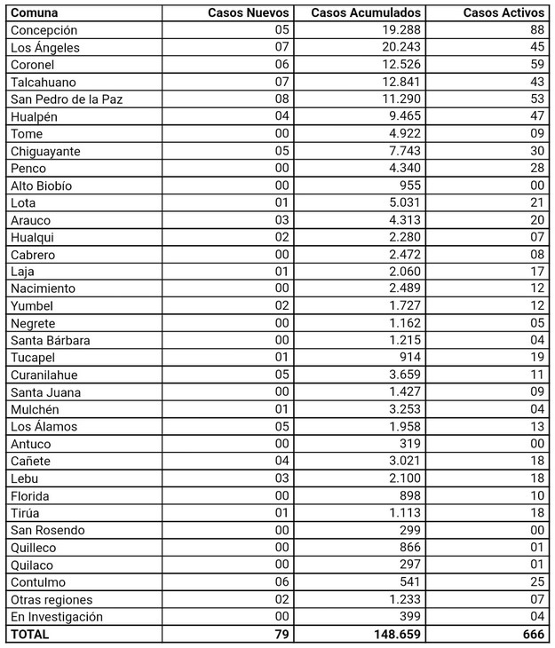 Junto con las cifras oficiales diarias, la Seremi de Salud informó que las comunas con mayor tasa de incidencia de casos activos corresponden a Contulmo, con 394.9 casos activos por cada 100 mil habitantes; Tirúa, con 163.4 casos por cada 100 mil; y Tucapel, con 125 casos por cada 100 mil habitantes.