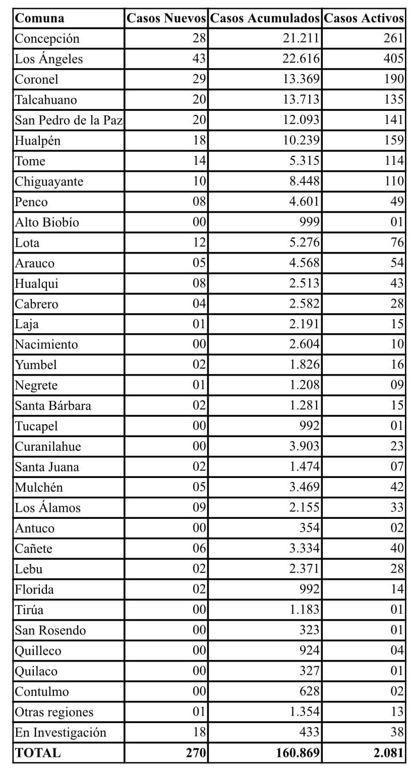 Según el informe, 23 de las 33 comunas de la región presentaron casos nuevos. En tanto, las comunas de Los Ángeles y Concepción lideran las cifras con 401 y 261 casos activos, respectivamente .