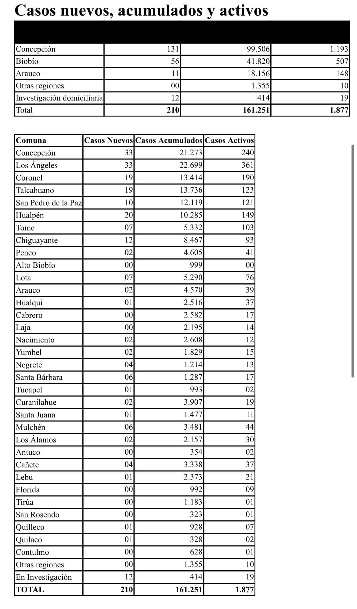 De acuerdo a la jefe de la cartera de Salud local (s),Isabel Rojas, el Ministerio de Salud notificó “161.251 casos acumulados de Covid-19, 99.506 en la provincia de Concepción, 41.820 en Biobío, 18.156 en Arauco, 1.355 de otras regiones y 414 en investigación domiciliaria. Adicionalmente se registran 1.877 casos activos, 1.193 en la provincia de Concepción, 507 en Biobío, 148 en Arauco, 10 en otras regiones y 19 casos en investigación domiciliaria”, detalló la autoridad sanitaria.