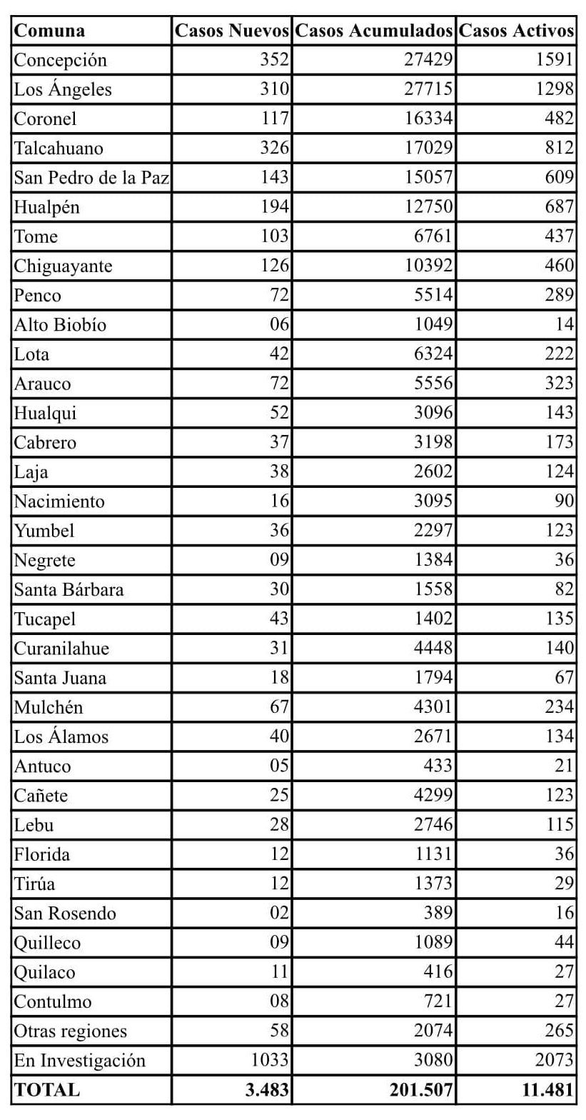 De acuerdo al balance del Ministerio de Salud, este primer sábado de febrero la Región del Biobío sumó 3.483 nuevos contagios confirmados de Covid-19. La mayor cifra histórica por cuarto día consecutivo y por segundo jornada por sobre los 3 mil.