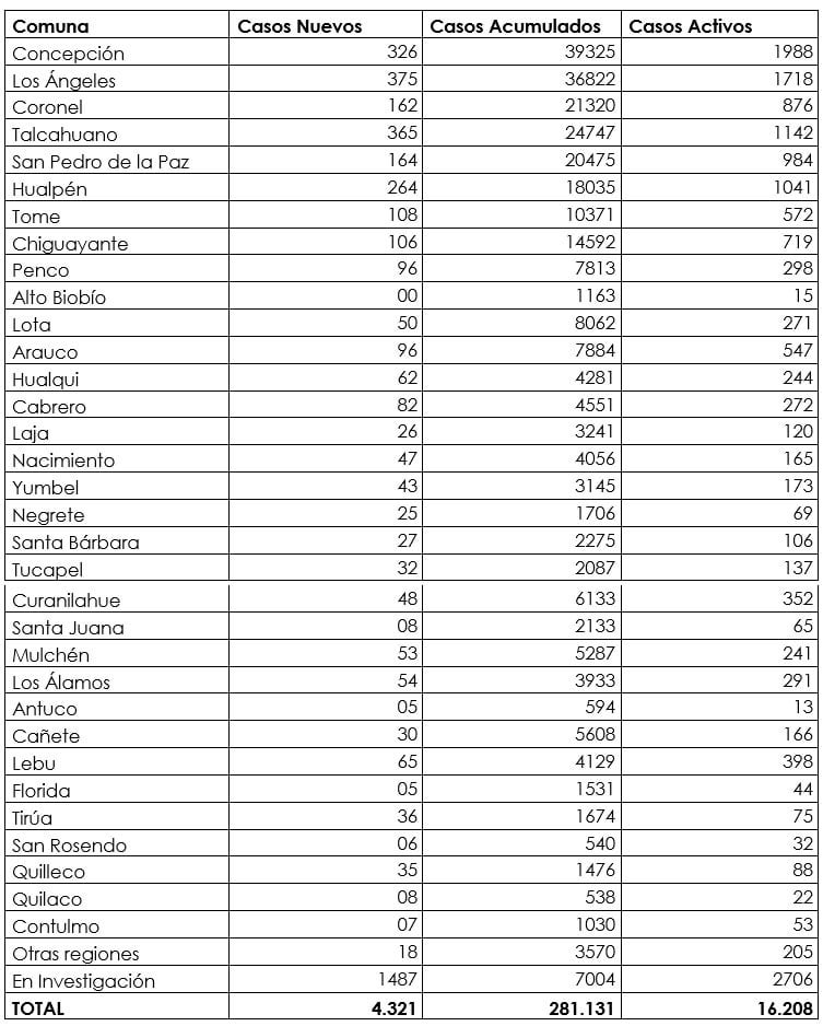 De acuerdo al jefe de la cartera de Salud local (s), Hugo Rojas, el Ministerio de Salud (Minsal) notificó “281.131 casos acumulados de covid-19, 172.685 en la provincia de Concepción, 67.481 en Biobío, 30.391 en Arauco, 3.570 de otras regiones y 7.004 en investigación domiciliaria”.