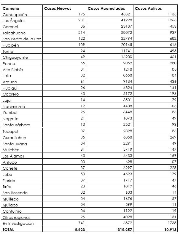 La Seremi de Salud del Biobío, Isabel Rojas, detalló que la región “registra 312.257 casos acumulados de Covid-19, 192.009 en la provincia de Concepción, 74.992 en Biobío, 34.356 en Arauco, 4.028 de otras regiones y 6.872 en investigación domiciliaria. Adicionalmente se registran 10.913 casos activos, 5.480 en la provincia de Concepción, 2.198 en Biobío, 1.346 en Arauco, 151 en otras regiones y 1.738 casos en investigación domiciliaria”.