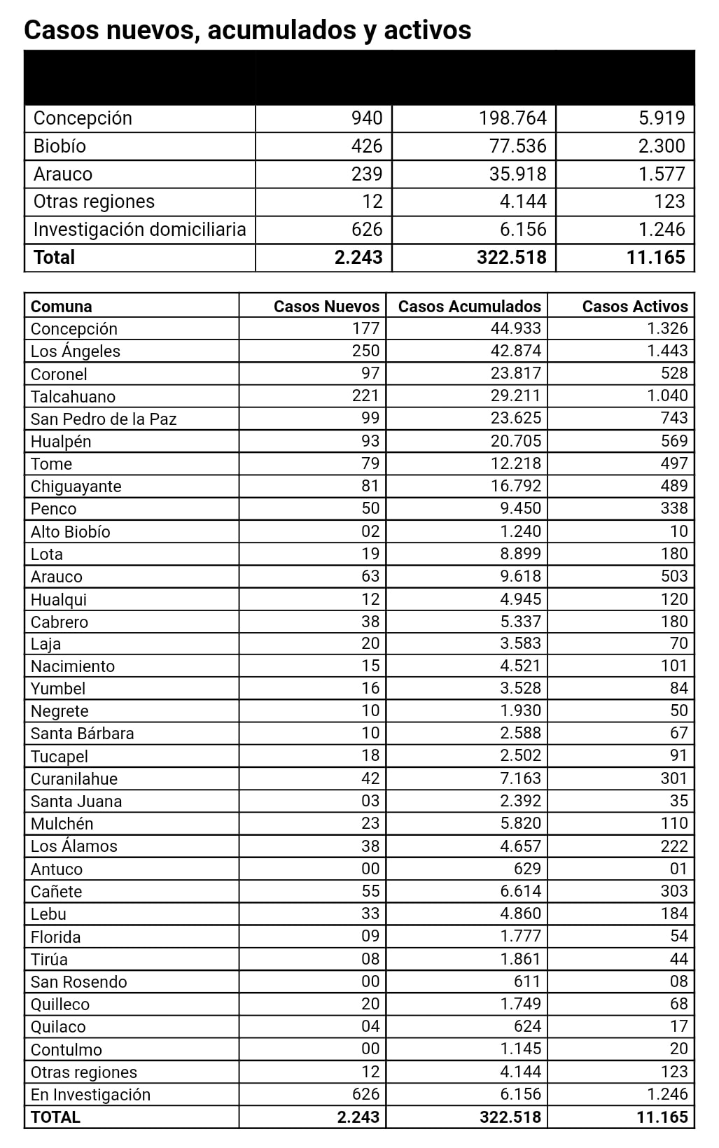 De acuerdo al jefe de la cartera de Salud local (s), Hugo Rojas, el Ministerio de Salud (Minsal) notificó “322.518 casos acumulados de Covid-19, 198.764 en la provincia de Concepción, 77.536 en Biobío, 35.918 en Arauco, 4.144 de otras regiones y 6.156 en investigación domiciliaria”.