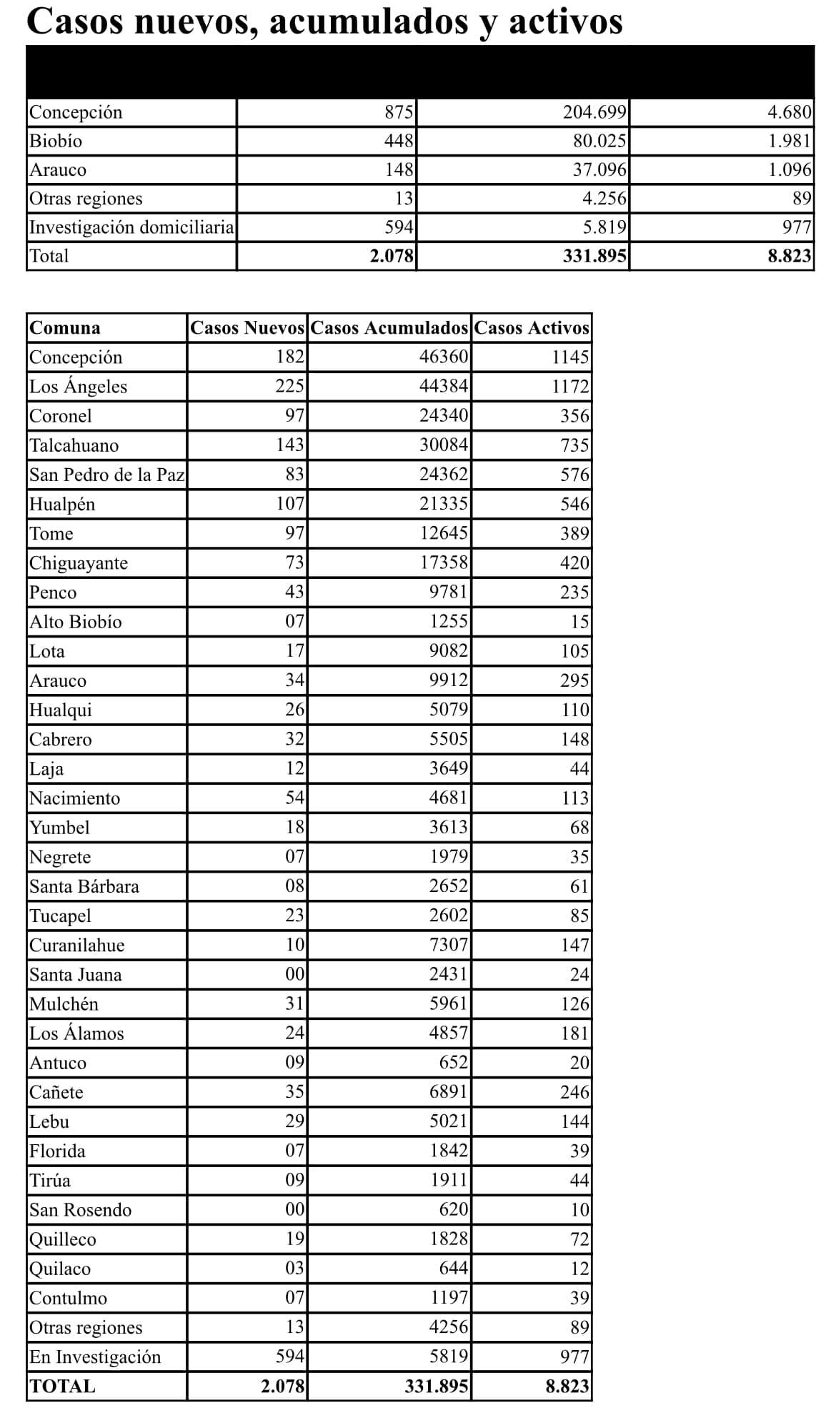 De acuerdo al reporte, el Ministerio de Salud (Minsal) notificó “331.895 casos acumulados de Covid-19, 204.699 en la provincia de Concepción, 80.025 en Biobío, 37.096 en Arauco, 4.256 de otras regiones y 5.819 en investigación domiciliaria”.
