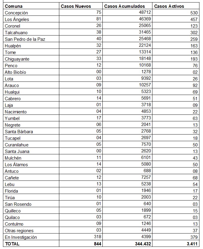 Una clara tendencia a la baja muestran las cifras de Covid-19 en la Región del Biobío en las últimas semanas. Hoy se registraron 844 nuevos contagios confirmados, la menor cifra de día miércoles desde enero, mes en que se comenzaron a superar los mil positivos diarios.