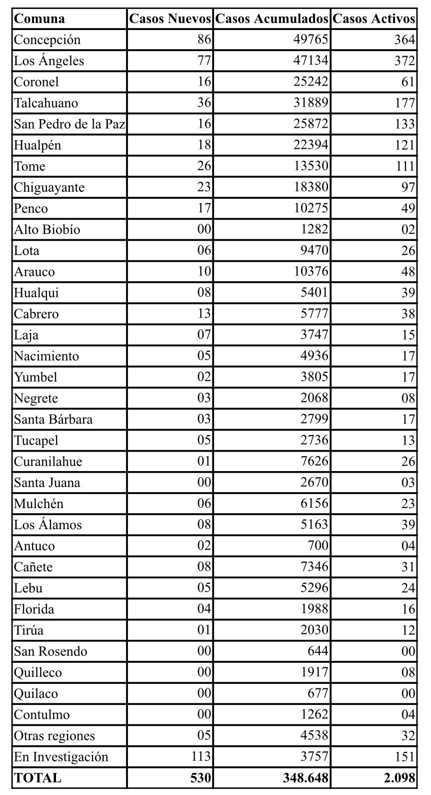 En un nuevo balance del Ministerio de Salud (Minsal), la Región del Biobío, en su primer día en Fase 4 (Apertura Inicial), registró una leve alza en los casos nuevos de Covid-19, con 530.