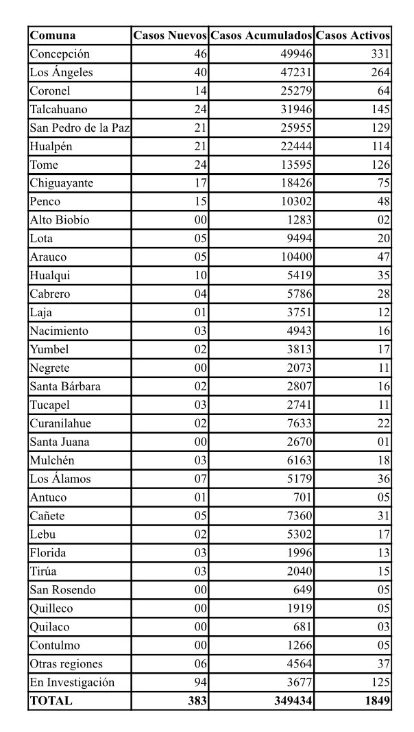 En un nuevo balance del Ministerio de Salud (Minsal), la Región del Biobío registró una baja en los casos nuevos de Covid-19, en comparación a esta semana, con 383.