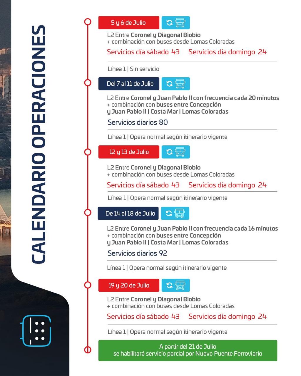 Según explicó EFE, desde el sábado 5 hasta el sábado 20 de julio, el tramo entre San Pedro de la Paz y Concepción será reemplazado por 51 buses de acercamiento, mientras se realizan las maniobras necesarias para la conexión de vías y sistemas en el nuevo viaducto.