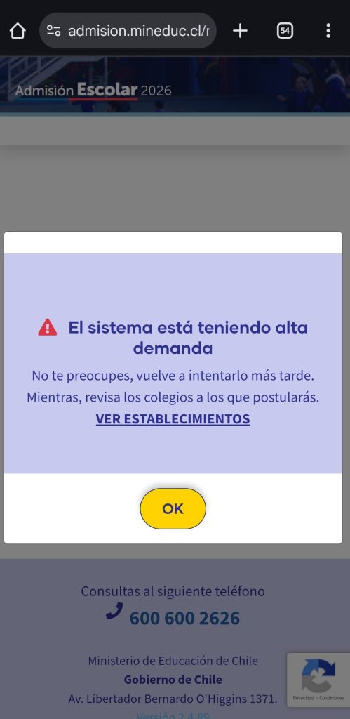 Así se ven los problemas en la plataforma del Sistema de Admisión Escolar