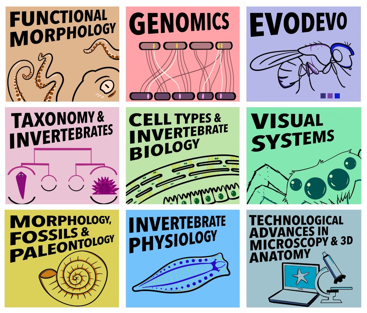 En específico, las conferencias se centrarán en la diversidad de planes y estructuras corporales de los invertebrados actuales y aquellos ya extintos, así como en sus transformaciones evolutivas, priorizando la investigación integradora que combina estudios morfológicos tradicionales con técnicas modernas de biología celular y molecular, genómica, y aproximaciones de vanguardia para el estudio de los invertebrados.