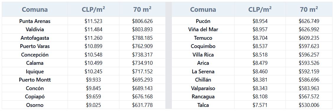 En este contexto, el informe revela el valor promedio por metro cuadrado (CLP/m²) de departamentos y el costo estimado para una propiedad de 70 m² en las ciudades más representativas del mercado regional.