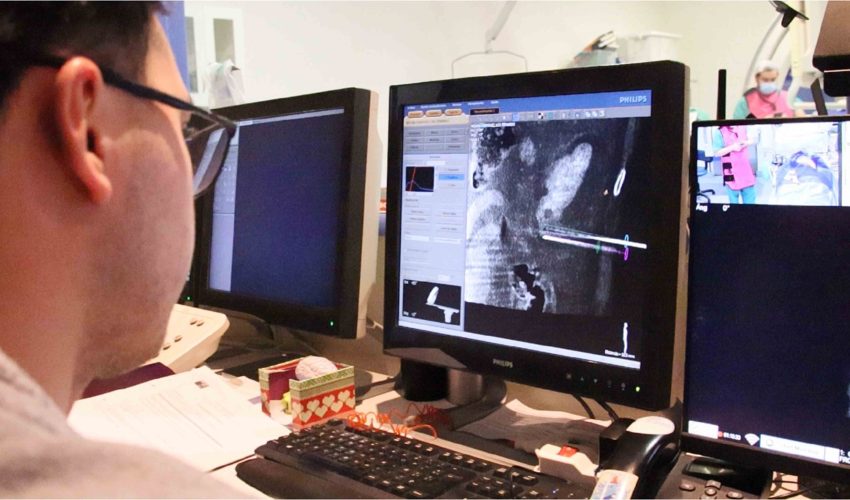“Se puso al paciente boca abajo. Ingresamos un catéter por la muñeca, cosa que no siempre es necesario, para llegar hasta el riñón y lograr ver bien el riñón y el tumor. Una vez que llegamos con el catéter hasta la arteria renal, le hicimos un escáner con inyección de contraste directa al riñón, ahí se visualizó el riñón y el tumor (…) Luego planificamos la posición que iban a tener las agujas y después de eso pinchamos con estereotaxia (las agujas)”, detalló Clemo.