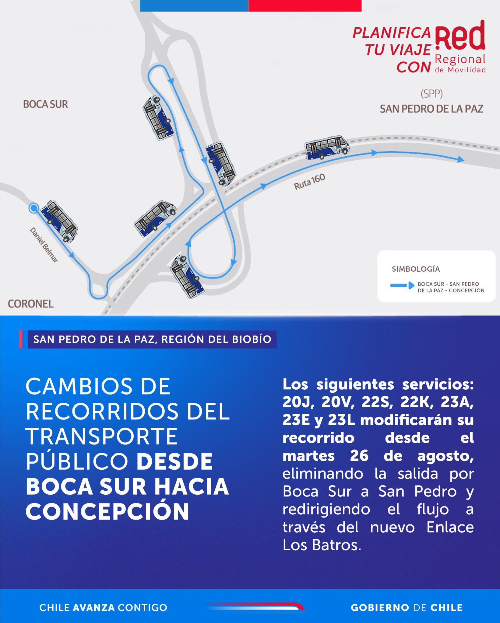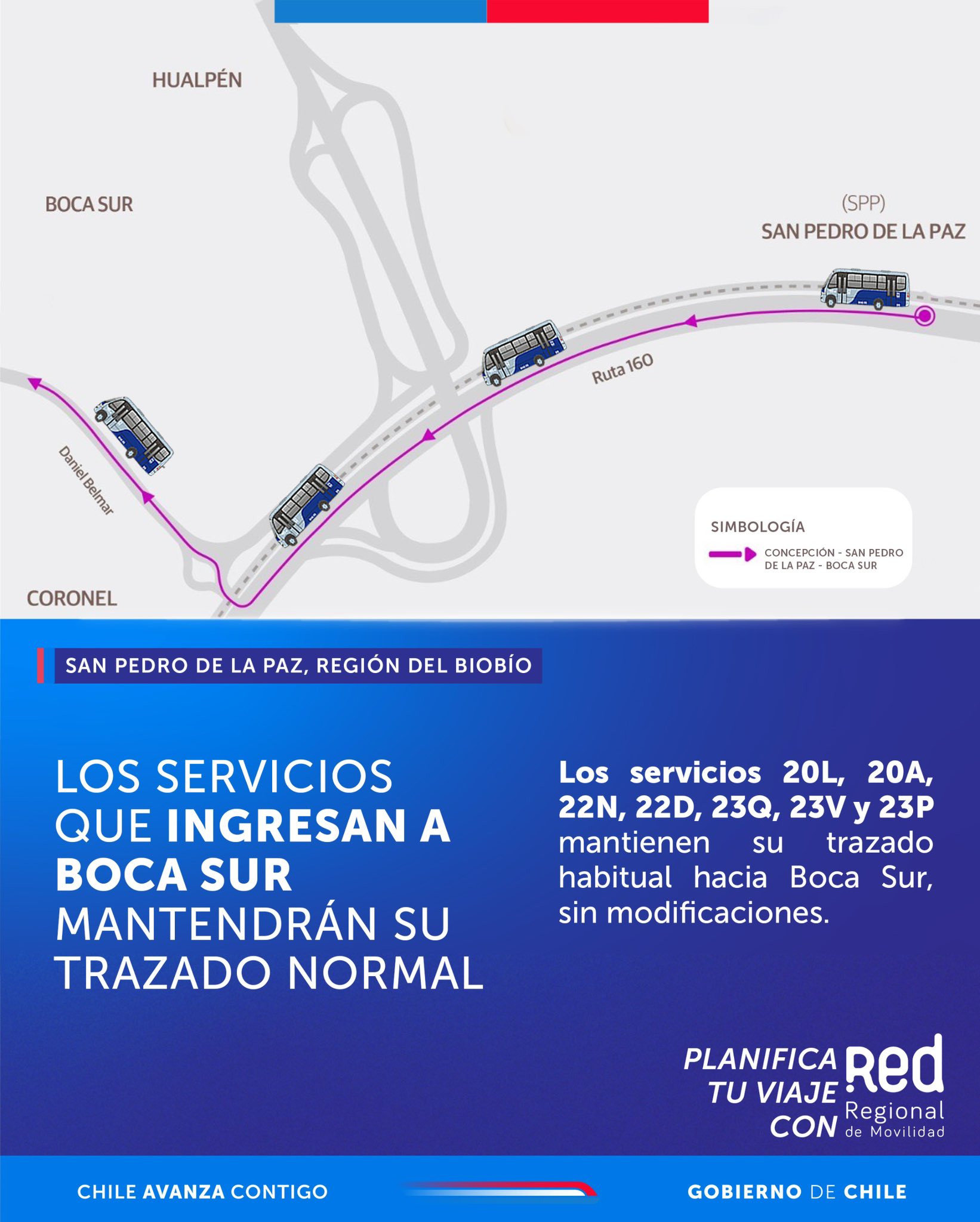 Esto en el contexto de la apertura parcial del Puente Industrial en San Pedro de la Paz, medida que incluye ajustes en siete recorridos de transporte público que utilizan el sector Boca Sur para dirigirse hacia Concepción, con el fin de mejorar los tiempos de viaje y reducir riesgos en uno de los puntos más conflictivos de la Ruta 160.