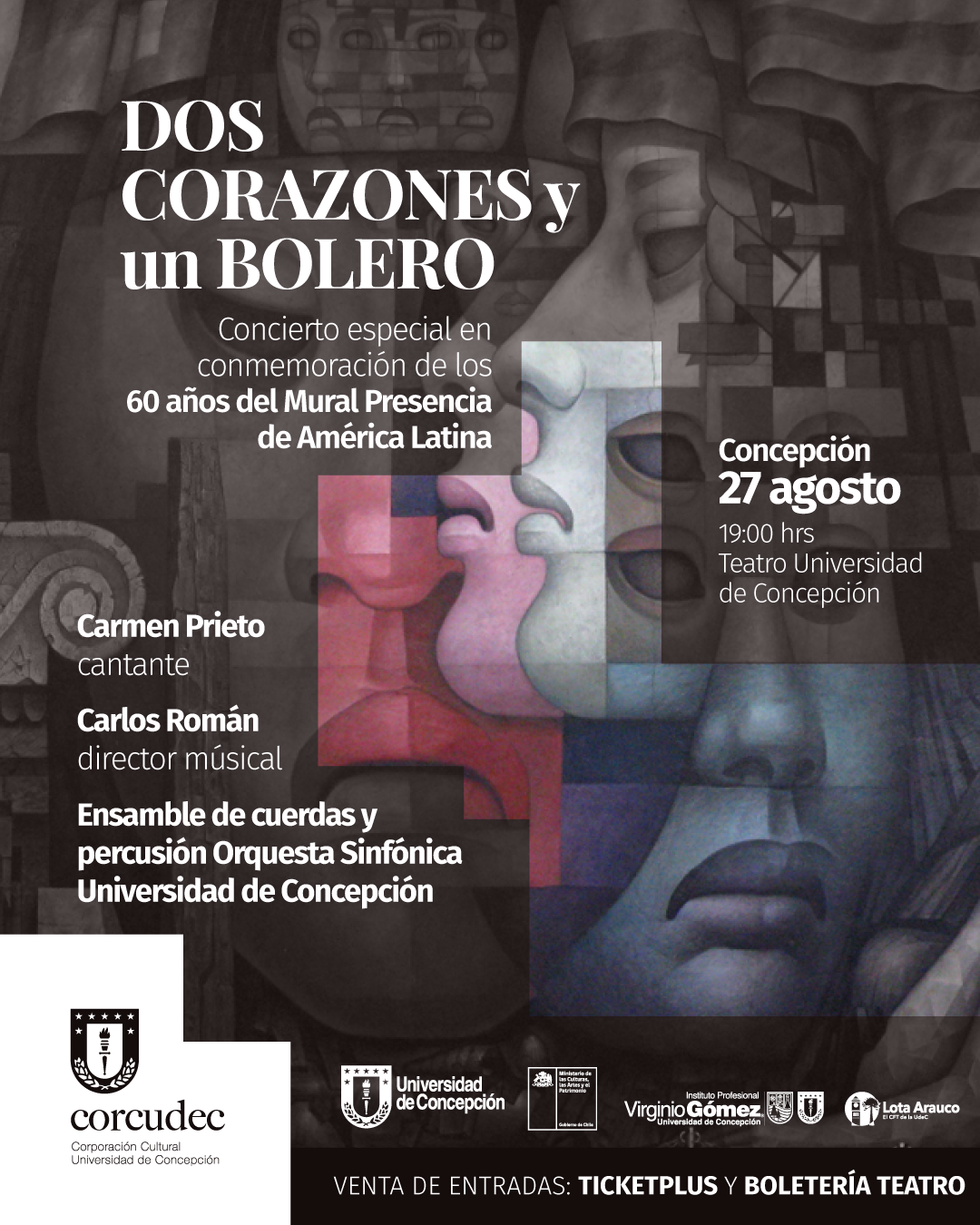 Este 27 de agosto a las 19:00 horas en el Teatro de la Universidad de Concepción, se presentará el concierto sinfónico-camerístico “Dos corazones y un bolero”, con la interpretación de los músicos del Ensamble de Cuerdas y Percusión de la Orquesta Sinfónica de la Universidad de Concepción y la participación especial de la cantante penquista, Carmen Prieto. Una noche que se enmarca dentro de las celebraciones de los 60 años del mural “Presencia de América Latina” ubicado en la Pinacoteca de la Universidad de Concepción, con boleros chilenos, mexicanos y puertorriqueños que evocarán las ilustraciones presentes en esa gran obra de arte.