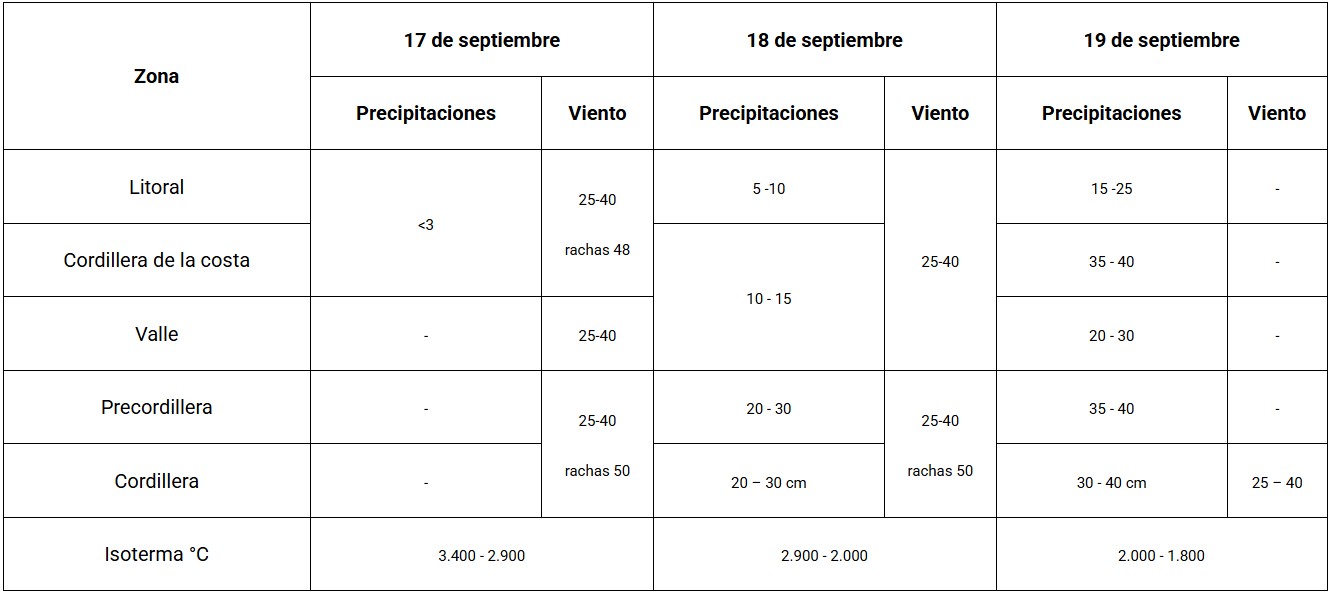 Además, “el Informe de Amenaza Meteorológica de la DMC indica que entre el jueves 18 y el sábado 20 de septiembre se esperan precipitaciones de intensidad normal a moderada, viento que podría alcanzar rachas de hasta 50 km/h y un descenso paulatino de la isoterma 0°C, alcanzando los 1.800 m.s.n.m. hacia el final del período”.