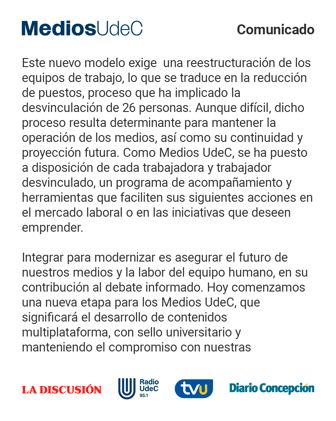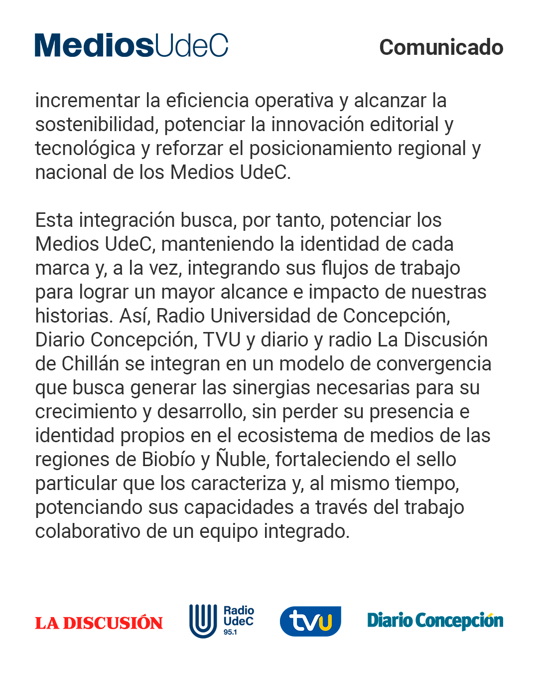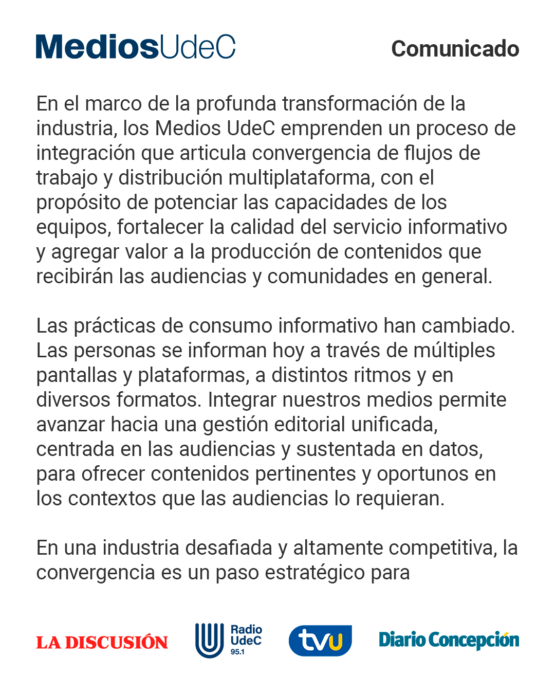 Declaración pública de Medios UdeC en relación con el proceso de integración que inicia como un paso estratégico para incrementar la eficiencia operativa y alcanzar la sostenibilidad, potenciar la innovación editorial y tecnológica y reforzar su posicionamiento regional y nacional.