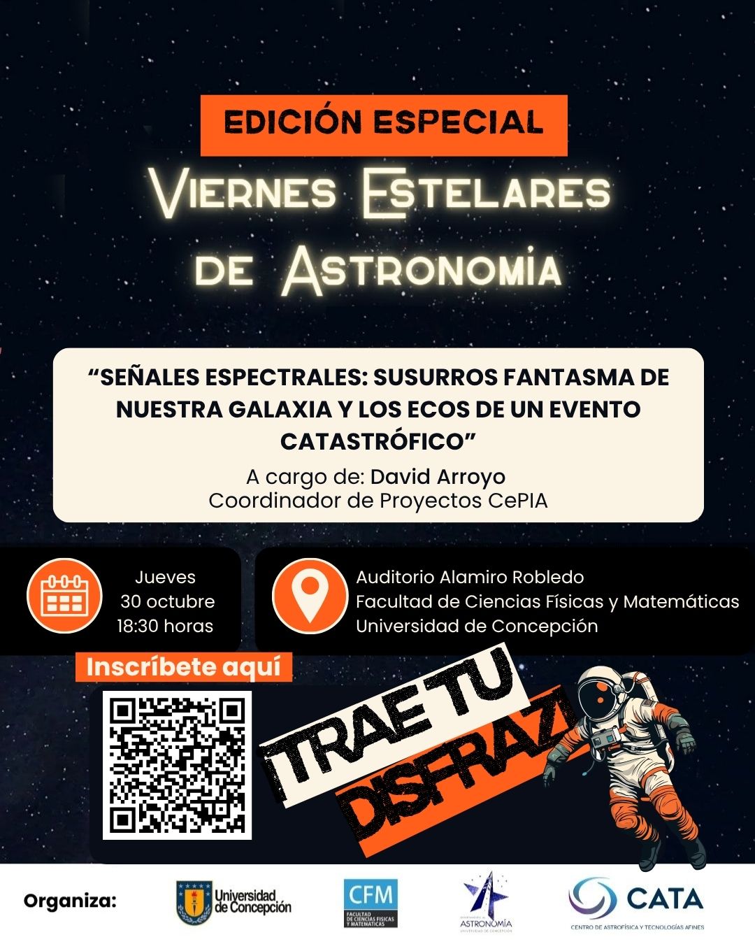 El Departamento de Astronomía de la Universidad de Concepción realizó una invitación a la comunidad a participar en una nueva edición de Viernes Estelares, que en esta ocasión se realizará el jueves 30 de octubre, con una propuesta que promete despertar la curiosidad científica y el asombro ante los misterios del universo.