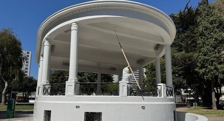 Este lunes, funcionarios de la Municipalidad de Concepción realizaron una jornada de limpieza y mantenimiento en el odeón de la Plaza Condell.