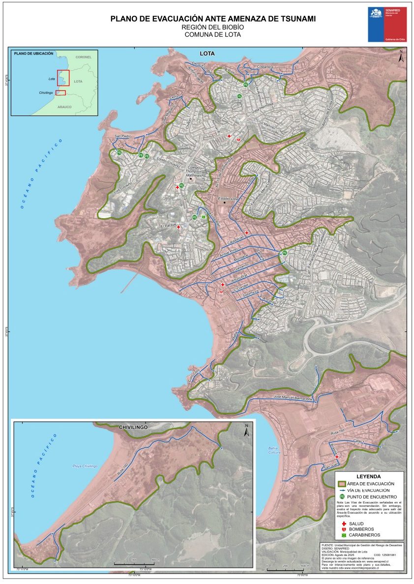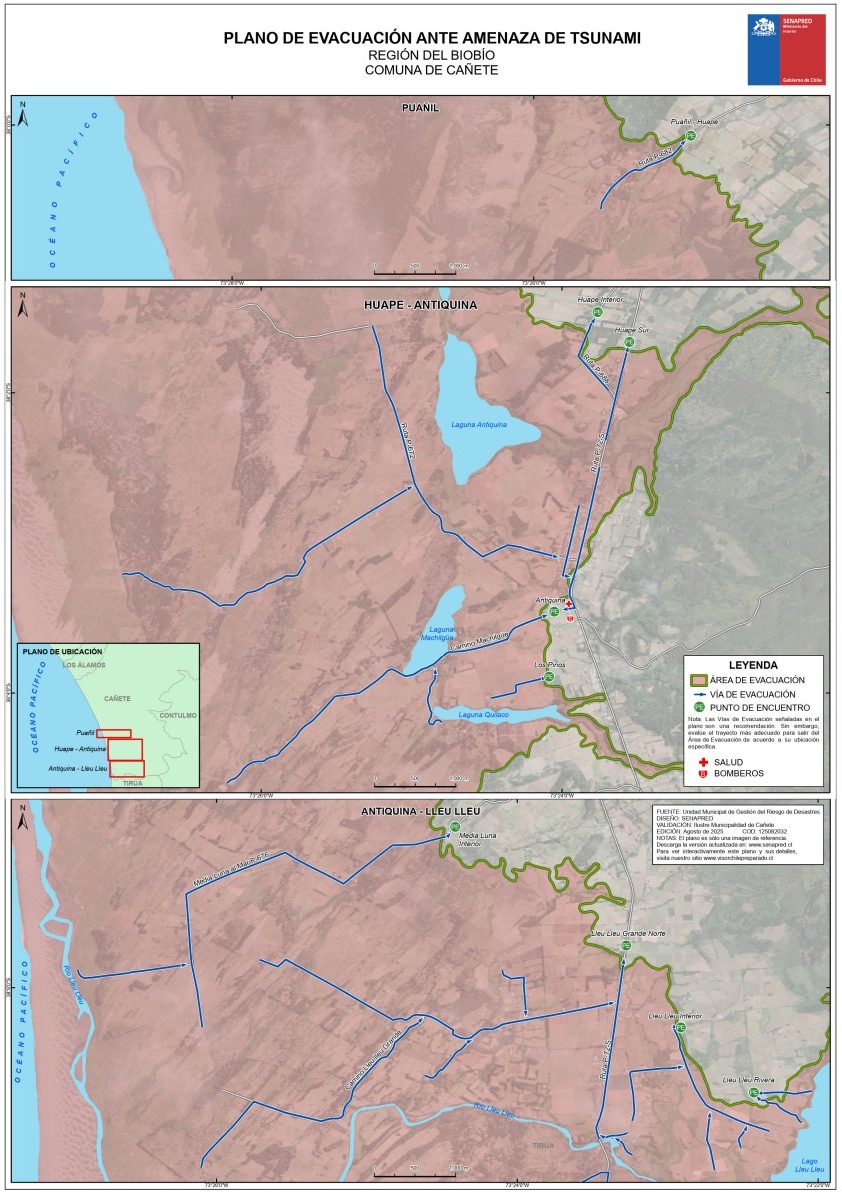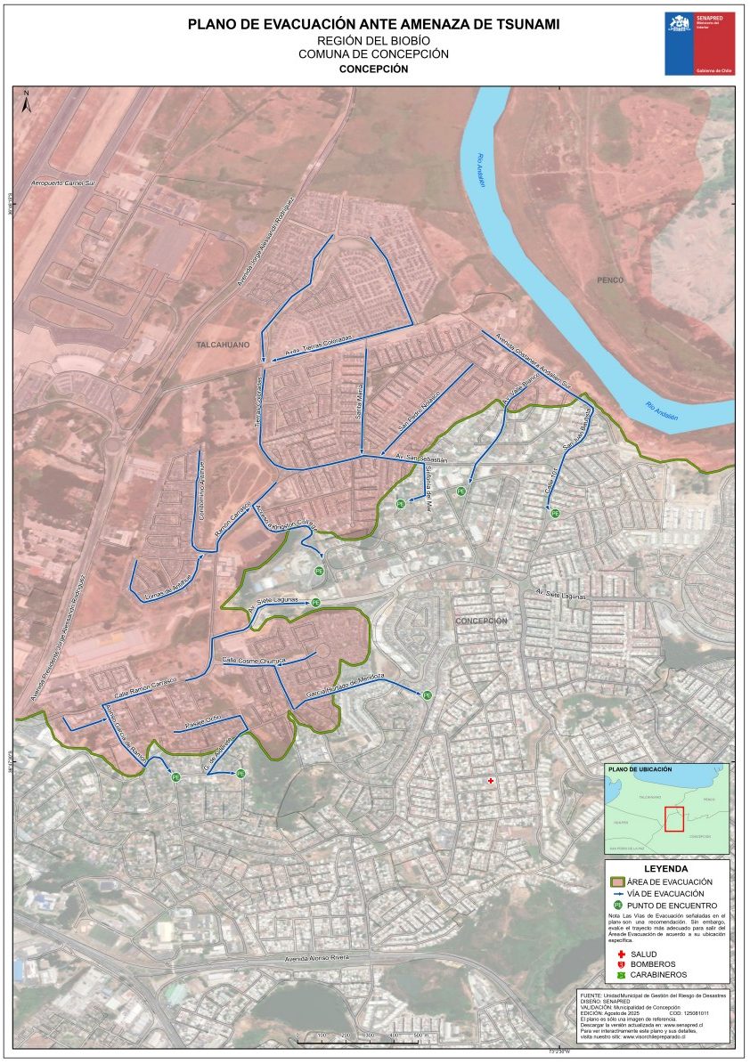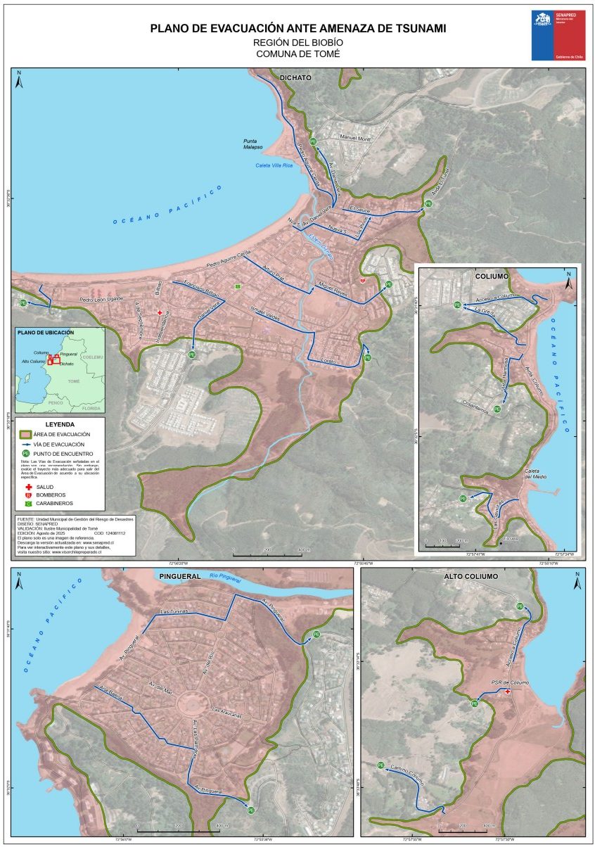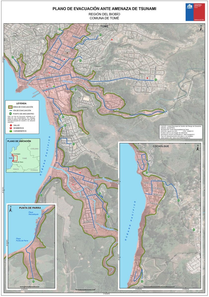 En definitiva, el llamado a evacuar se encuentra dirigido a las zonas de riesgo de las siguientes comunas: Tomé, Penco, Talcahuano, Hualpén, San Pedro de la Paz, Coronel, Lota, Arauco, Lebu, Los Álamos, Cañete, Tirúa e Isla Santa María.
