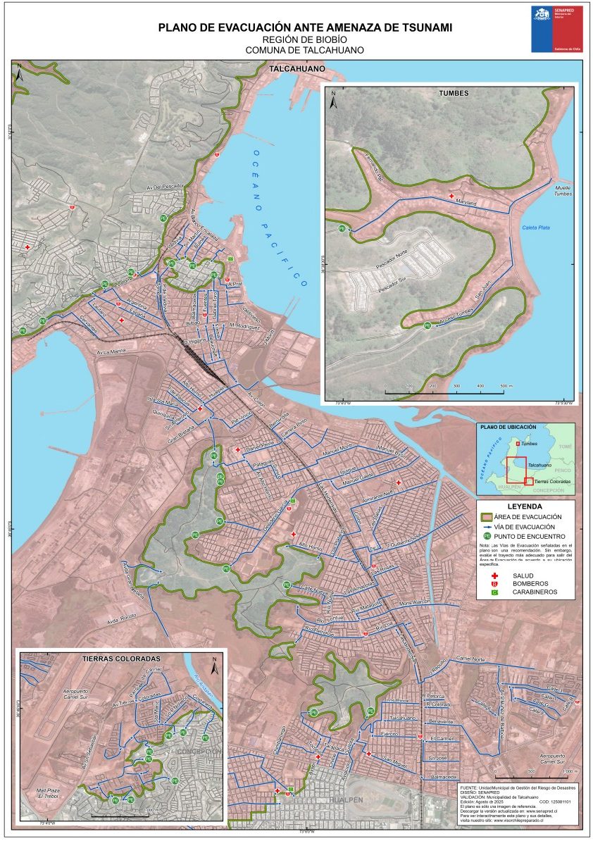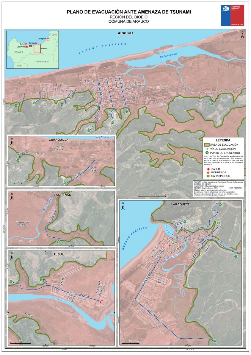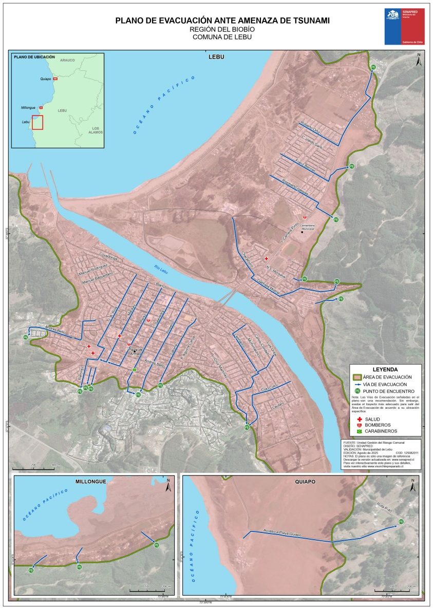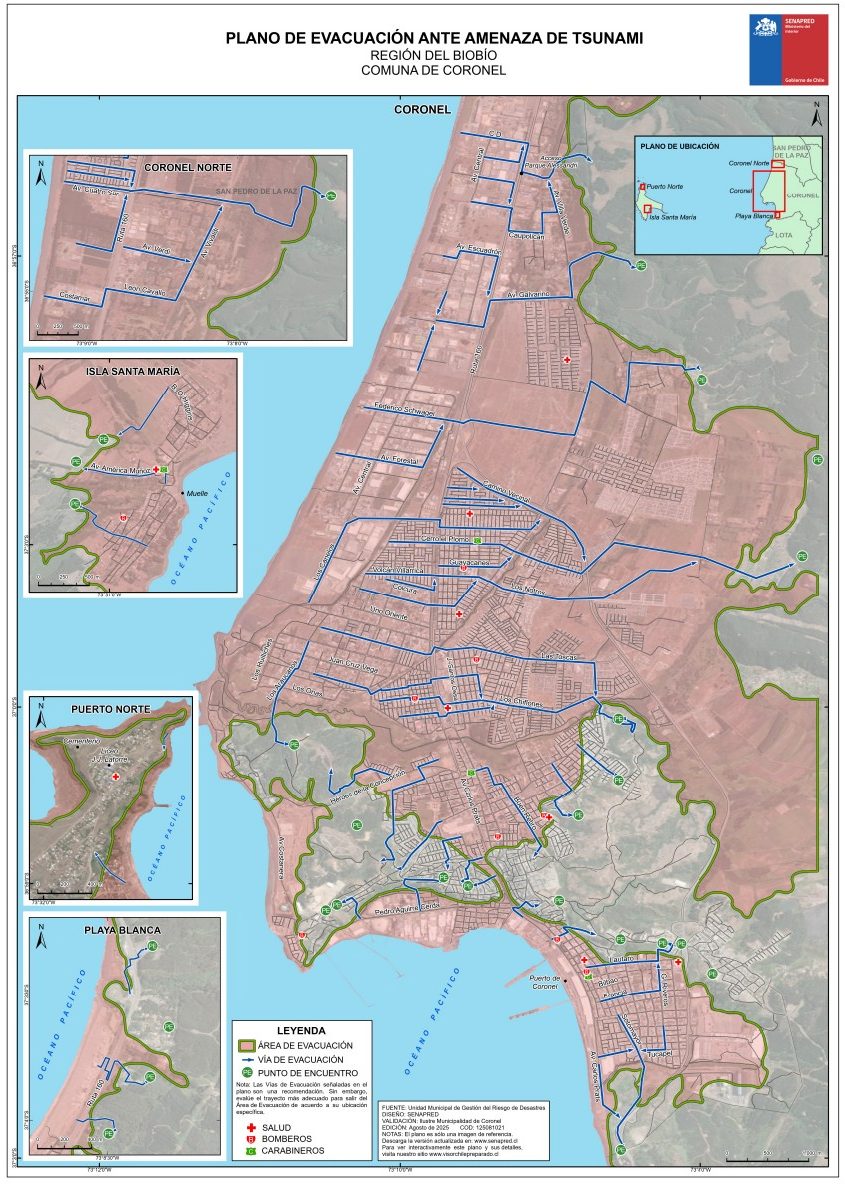 En definitiva, el llamado a evacuar se encuentra dirigido a las zonas de riesgo de las siguientes comunas: Tomé, Penco, Talcahuano, Hualpén, San Pedro de la Paz, Coronel, Lota, Arauco, Lebu, Los Álamos, Cañete, Tirúa e Isla Santa María.