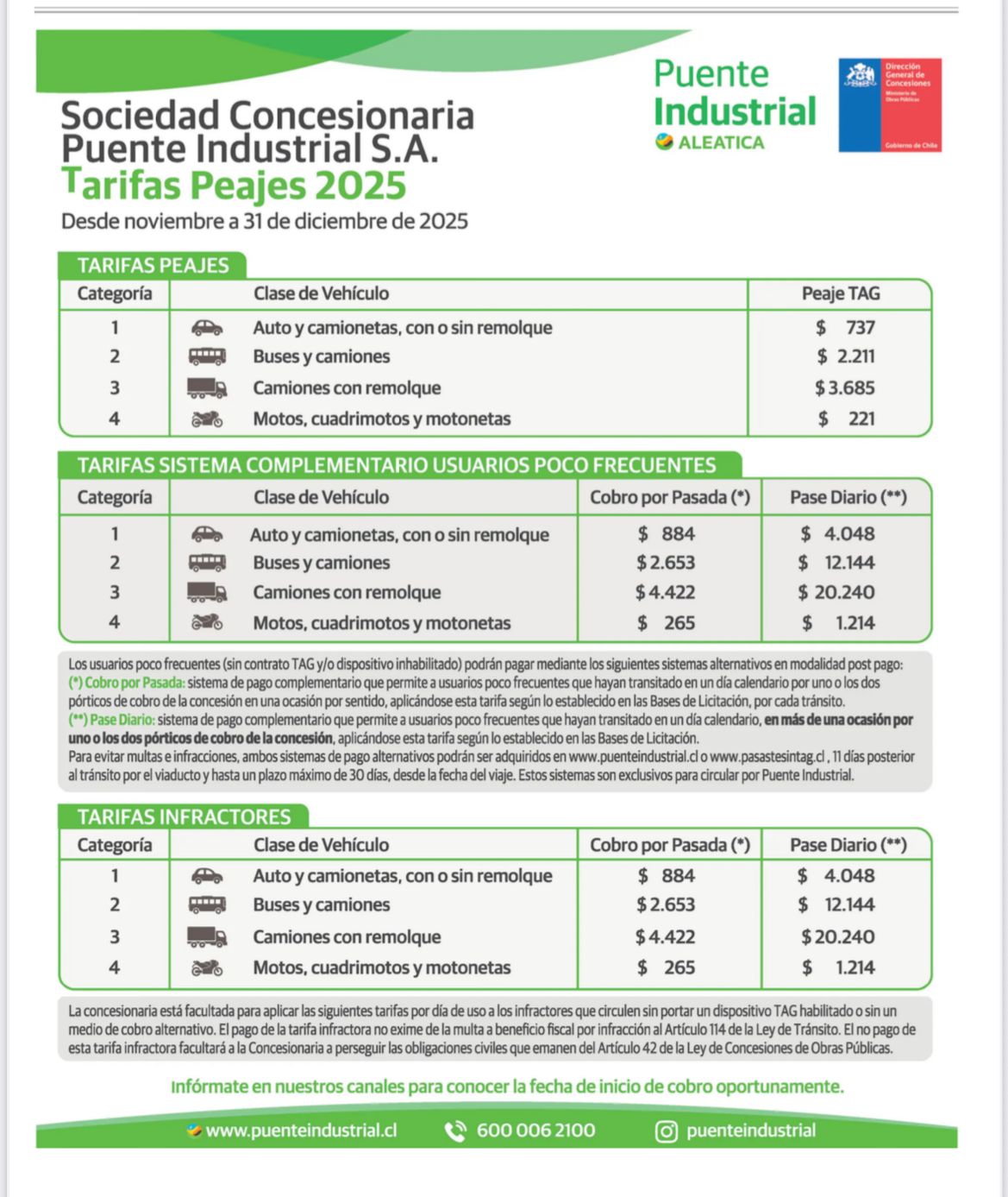 La Sociedad Concesionaria Puente Industrial publicó de manera oficial las tarifas de peajes 2025.