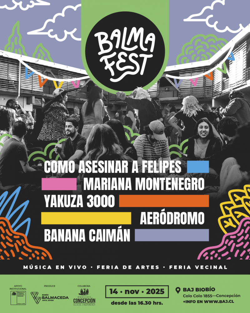 Es una de las citas musicales imperdibles de cada temporada, la cual mezcla talento emergente local junto con bandas nacionales de renombre. Se trata de Balmafest, cita organizada por Balmaceda Arte Joven sede Biobío (BAJ Biobío) que reunirá en su versión 2025 destacados nombres emergentes de la zona con artistas de mayor recorrido y preencia internacional. Evento musical gratuito que este año cuenta con la colaboración de la Municipalidad de Concepción y el apoyo del Ministerio de las Culturas, las Artes y el Patrimonio. El público podrá asistir a esta iniciativa mañana viernes 14 de noviembre desde las 16.30 horas en la sede de BAJ Biobío (Colo Colo 1855).