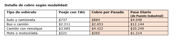 El valor del peaje con TAG variará entre $220 y $3.700, según la categoría del vehículo, aplicándose en ambos sentidos del puente.
