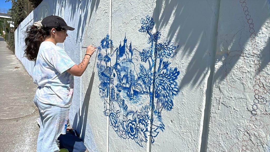La artista pencona Francisca Salinas “Sayen” está a cargo de la intervención, realizando cada plato con pintura látex sobre muro. “Cada plato me está tomando aproximadamente medio día, entonces tengo, bajo la propuesta, un mes para poder realizarlo”, explicó la artista.