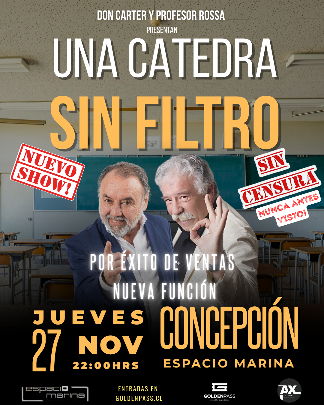 Tras el éxito de ventas de su primera presentación, Iván Arenas, conocido por décadas como el icónico “Profesor Rosa”, y Don Carter anuncian una nueva función de su espectáculo “Una Cátedra Sin Filtro” en Concepción.