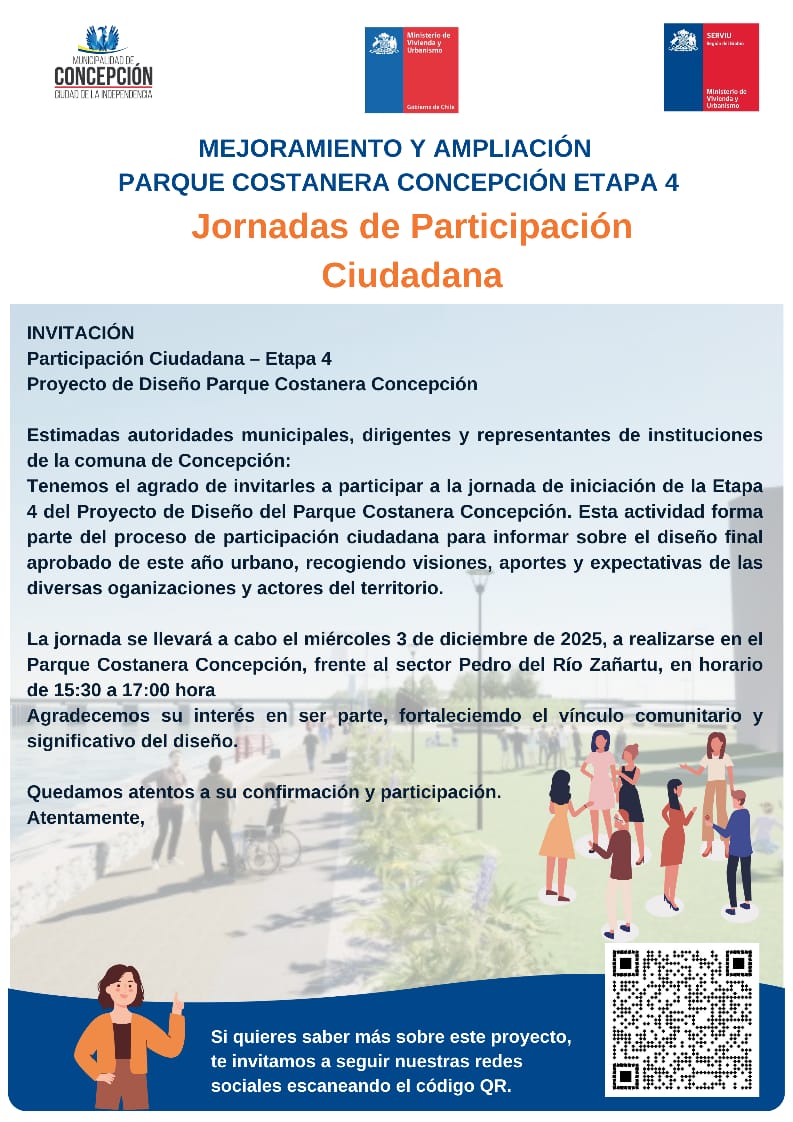 El Servicio de Vivienda y Urbanismo (Serviu) del Biobío confirmó la realización de una nueva instancia participativa por el reinicio de la Etapa 4 del proyecto de diseño “Parque Costanera Concepción”. La actividad se llevará a cabo el 3 de diciembre de 2025, a las 15:30 horas, en el Parque Costanera, frente al sector Pedro del Río Zañartu, en Concepción.