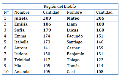 A nivel regional, durante 2025 los tres nombres más inscritos fueron Julieta, Emilia y Sofía en niñas, mientras que en niños lideraron Mateo, Liam y Lucas.