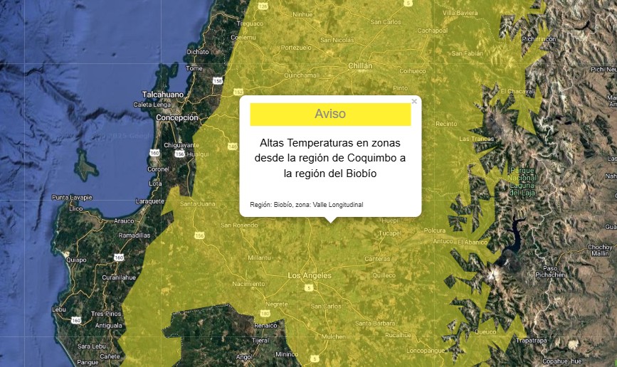 La Dirección Meteorológica de Chile (DMC) emitió un nuevo aviso meteorológico para la Región del Biobío, en el que advierte la presencia de una dorsal en altura, condición sinóptica asociada a altas temperaturas, desde la tarde del viernes 16 de enero hasta el domingo 18.