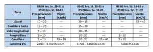 A su vez, de acuerdo con el Informe de Amenaza Meteorológica emitido durante la presente jornada, se prevén los siguientes montos de precipitaciones (mm – cm), viento (km/h) y altura de isoterma 0°C (m.s.n.m.).