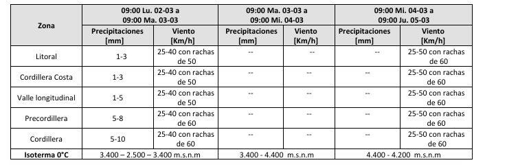 - Aviso Meteorológico A90-2/2026, emitido el lunes 02 de marzo de 2026 a las 10:22 hrs., que prevé una condición sinóptica de sistema frontal, asociado a probables tormentas eléctricas en zonas del litoral, cordillera costa, valle, precordillera y cordillera de la región, durante la mañana a la tarde del lunes 02 de marzo del 2026.