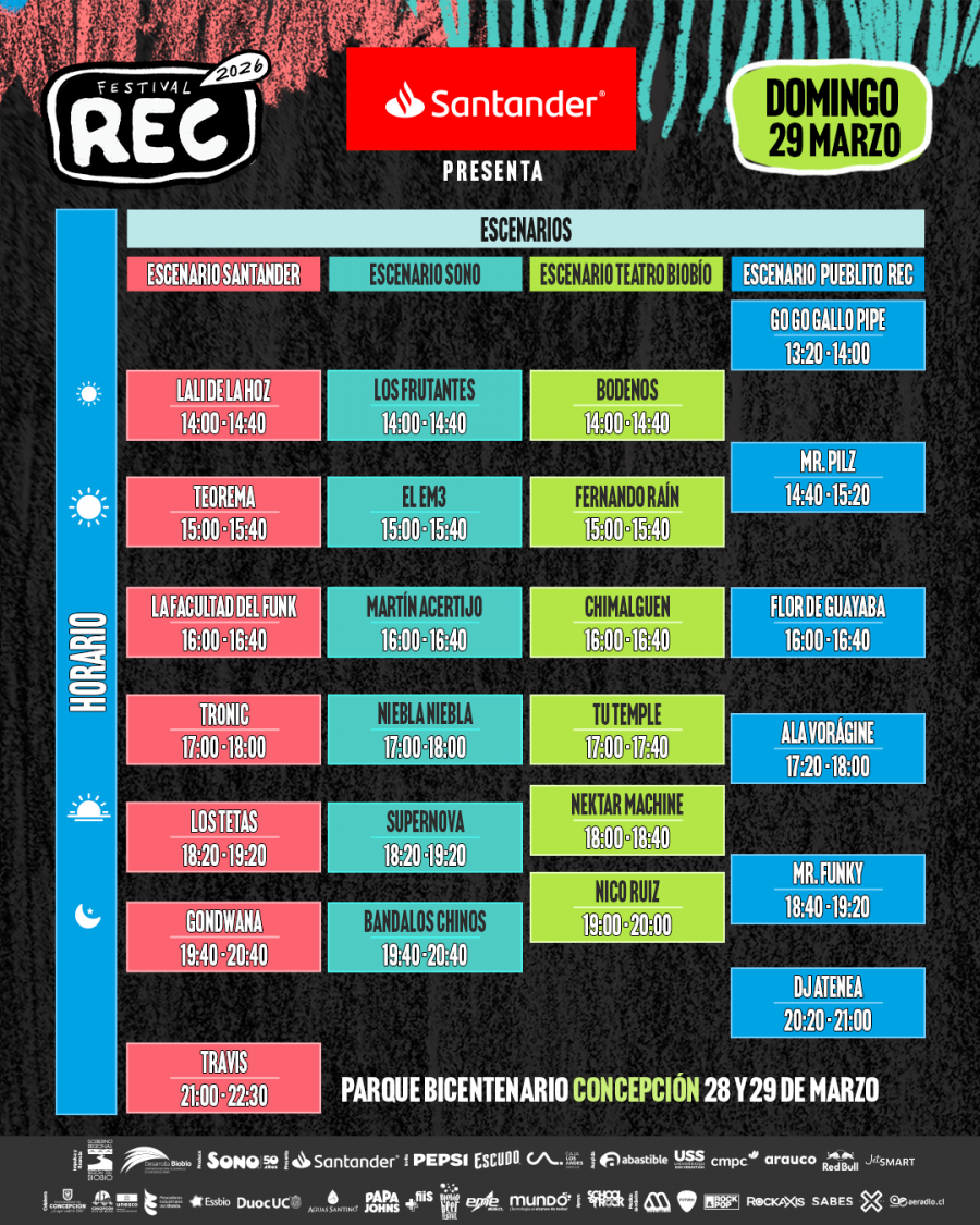 A poco más de una semana que despliege su decimoprimera versión en el Parque Bicentenario, el Festival REC dio a conocer la jornada de ayer los horarios específicos, y también escenarios, de los diversos artistas y bandas locales, nacionales e internacionales que engrosan su cartel 2026. Hito de lanzamiento que tuvo como escenario la intersección de las calles Barros Arana con Caupolicán, y que fue amenizado en vivo con la presentación de la banda penquista Diagonal.
